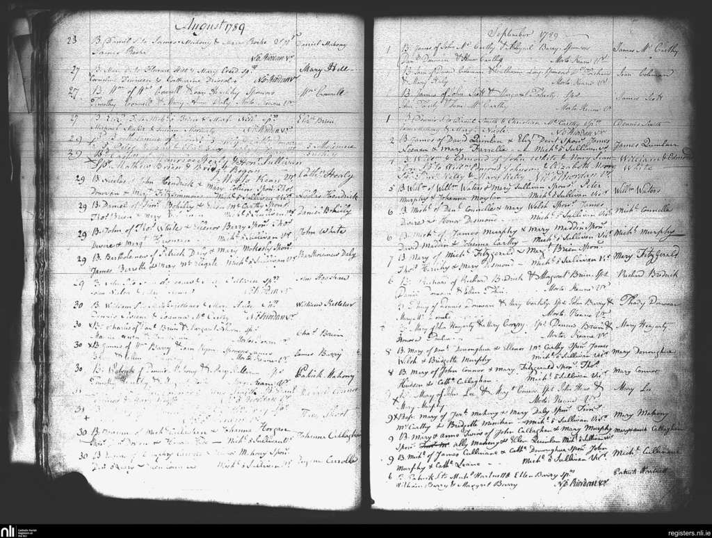 St. Mary's, Cork city; County of Cork; Diocese of Cork and Ross. Baptisms, Aug. 1789 to Sep. 1789