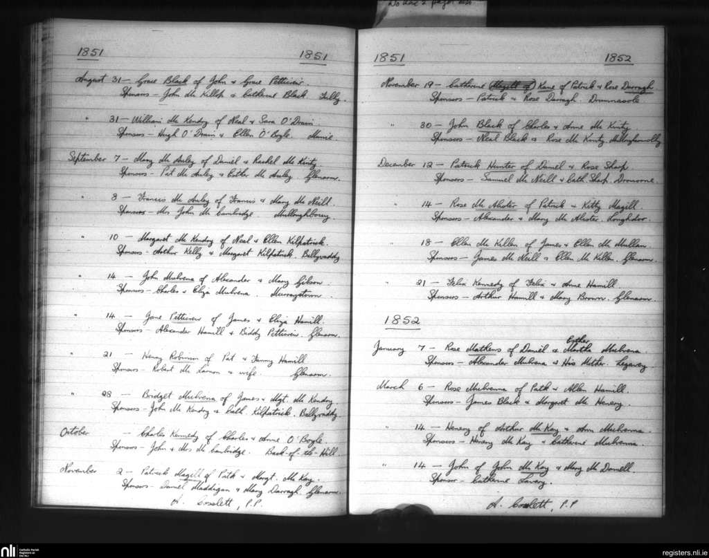 Glenarm; County of Antrim; Diocese of Down and Connor. Baptisms, Aug. 1851 to Mar. 1852