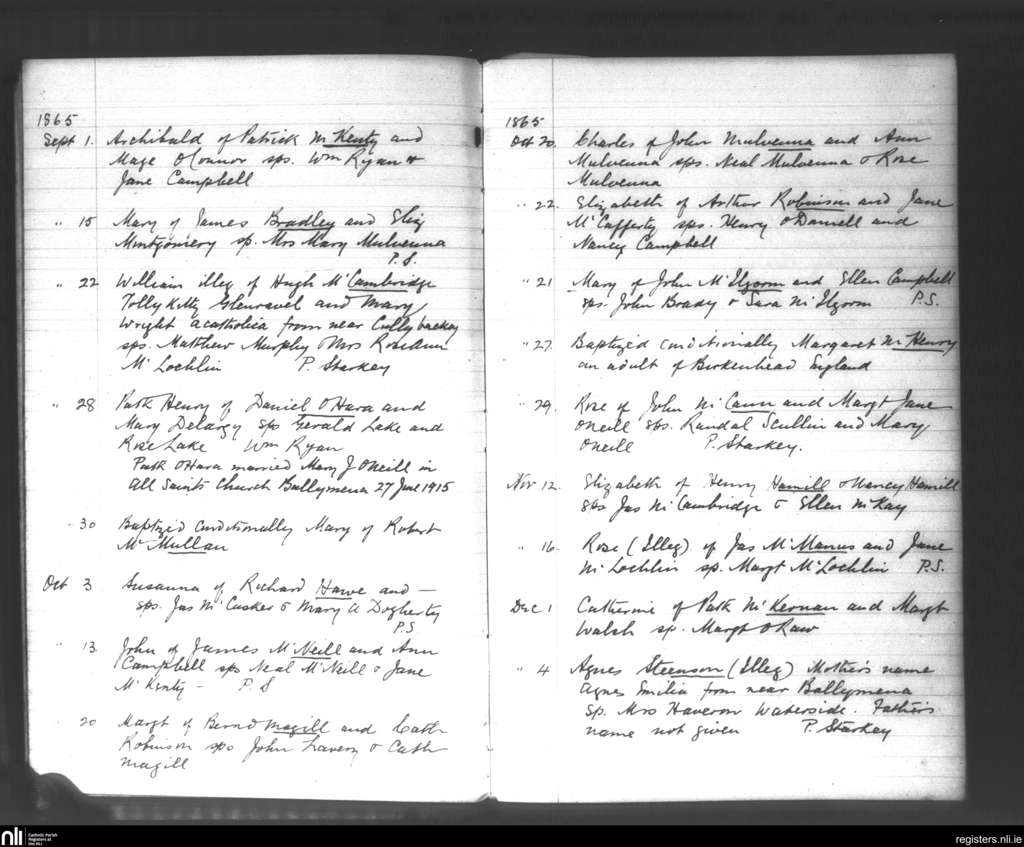 Glenarm; County of Antrim; Diocese of Down and Connor. Baptisms, Sep. 1865 to Dec. 1865