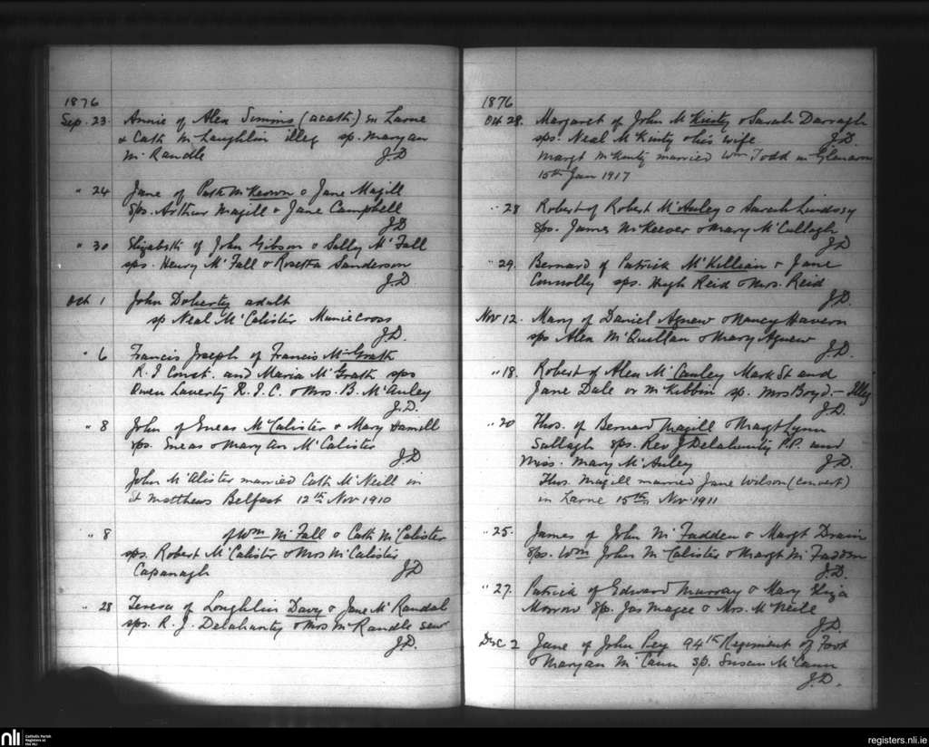 Glenarm; County of Antrim; Diocese of Down and Connor. Baptisms, Sep. 1876 to Dec. 1876