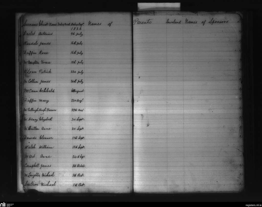 Glenravel; County of Antrim; Diocese of Down and Connor. Baptisms, July 1826 to Oct. 1826