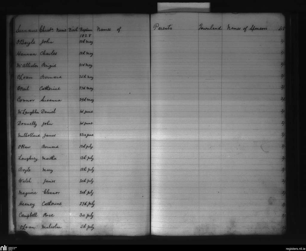 Glenravel; County of Antrim; Diocese of Down and Connor. Baptisms, May 1828 to July 1828
