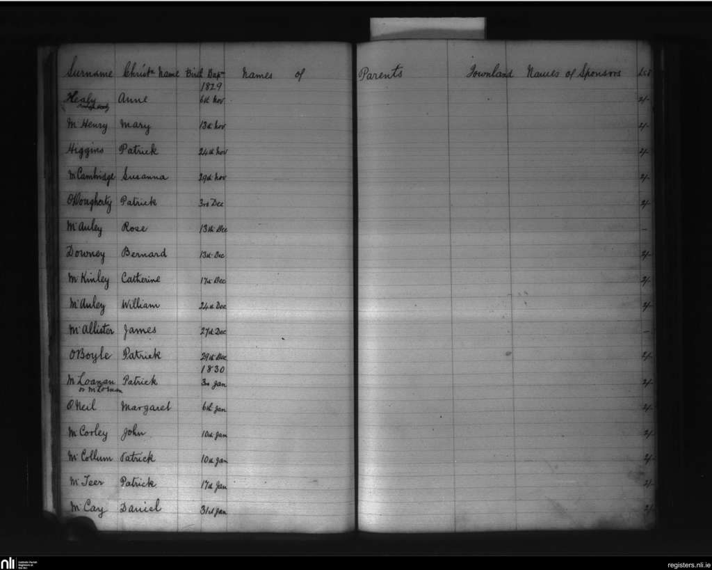 Glenravel; County of Antrim; Diocese of Down and Connor. Baptisms, Nov. 1829 to Jan. 1830