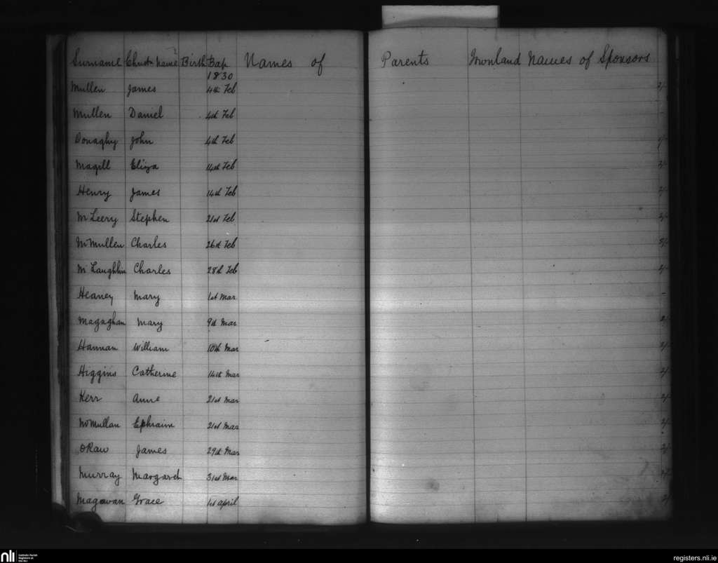 Glenravel; County of Antrim; Diocese of Down and Connor. Baptisms, Feb. 1830 to Apr. 1830