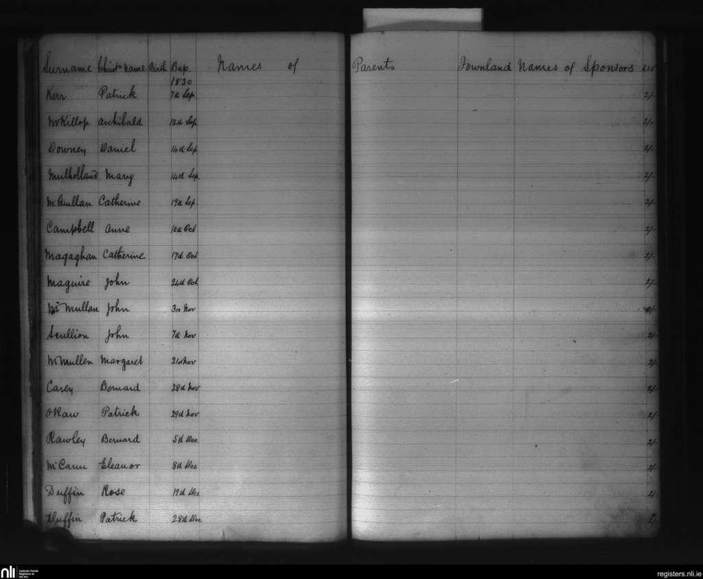Glenravel; County of Antrim; Diocese of Down and Connor. Baptisms, Sep. 1830 to Dec. 1830