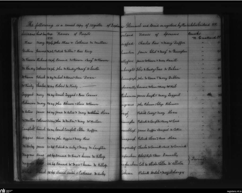 Glenravel; County of Antrim; Diocese of Down and Connor. Baptisms, July 1832 to Sep. 1832