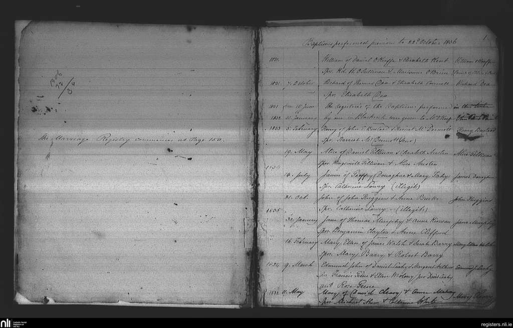 St. Patrick's, Cork city; County of Cork; Diocese of Cork and Ross. Baptisms, Oct. 1831 to Feb. 1835