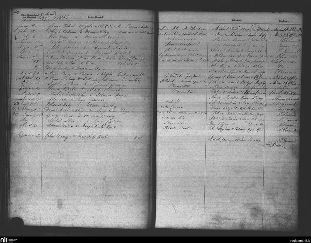 St. Patrick's, Cork city; County of Cork; Diocese of Cork and Ross. Marriages, June 1851 to Sep. 1852