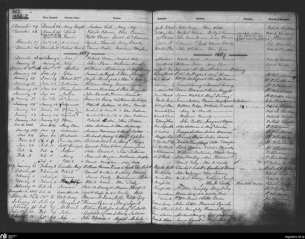 St. Patrick's, Cork city; County of Cork; Diocese of Cork and Ross. Baptisms, Dec. 1866 to Feb. 1867