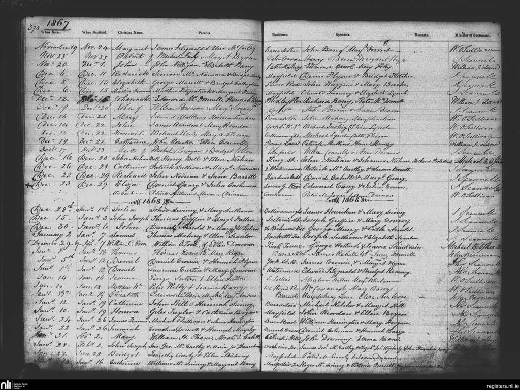 St. Patrick's, Cork city; County of Cork; Diocese of Cork and Ross. Baptisms, Nov. 1867 to Feb. 1868