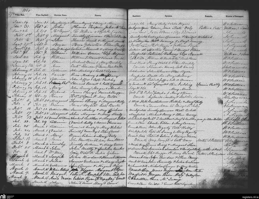 St. Patrick's, Cork city; County of Cork; Diocese of Cork and Ross. Baptisms, Jan. 1868 to Mar. 1868