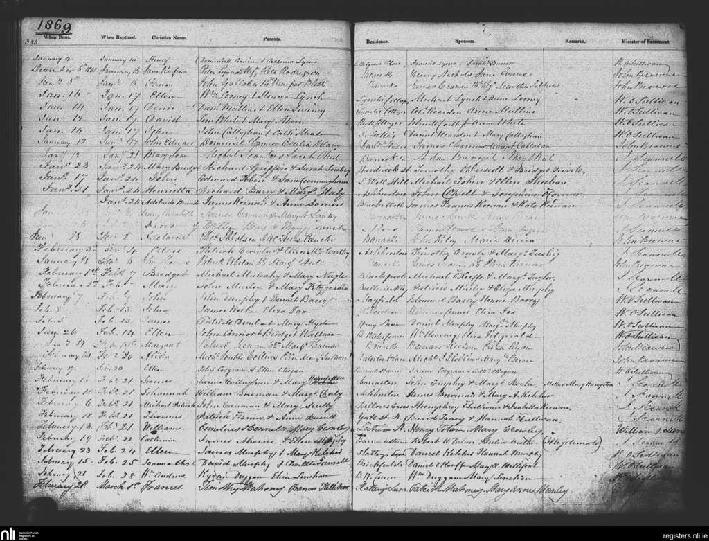 St. Patrick's, Cork city; County of Cork; Diocese of Cork and Ross. Baptisms, Jan. 1869 to Mar. 1869