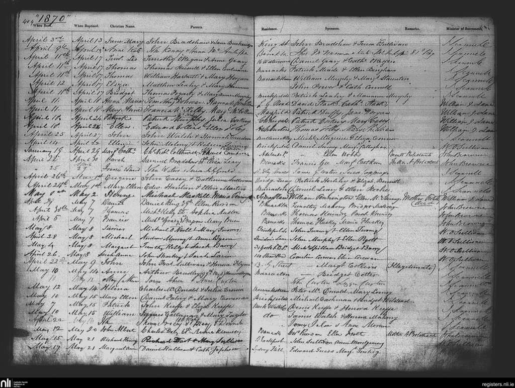 St. Patrick's, Cork city; County of Cork; Diocese of Cork and Ross. Baptisms, Apr. 1870 to May 1870
