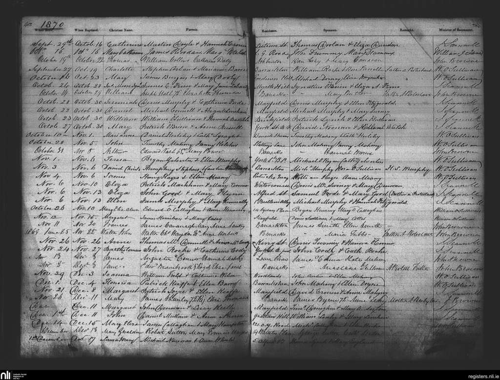 St. Patrick's, Cork city; County of Cork; Diocese of Cork and Ross. Baptisms, Oct. 1870 to Dec. 1870