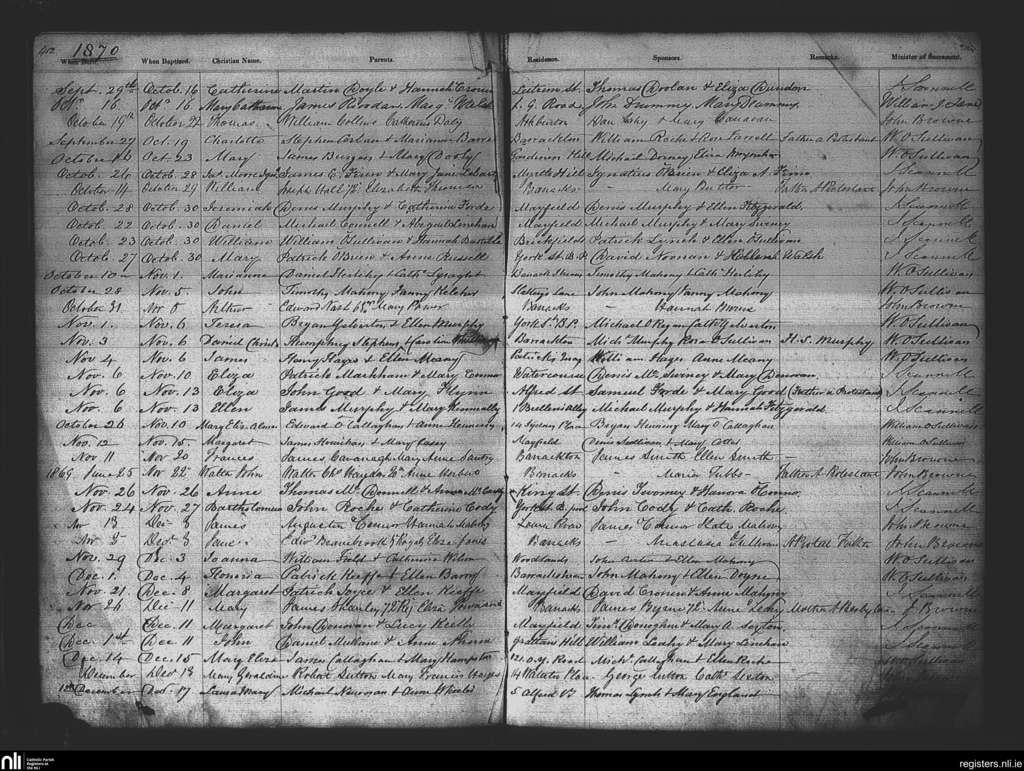 St. Patrick's, Cork city; County of Cork; Diocese of Cork and Ross. Baptisms, Oct. 1870 to Dec. 1870