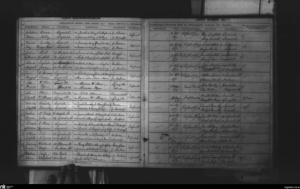 Holy Cross, Belfast city; County of Antrim; Diocese of Down and Connor. Marriages, Feb. 1871 to Aug. 1871