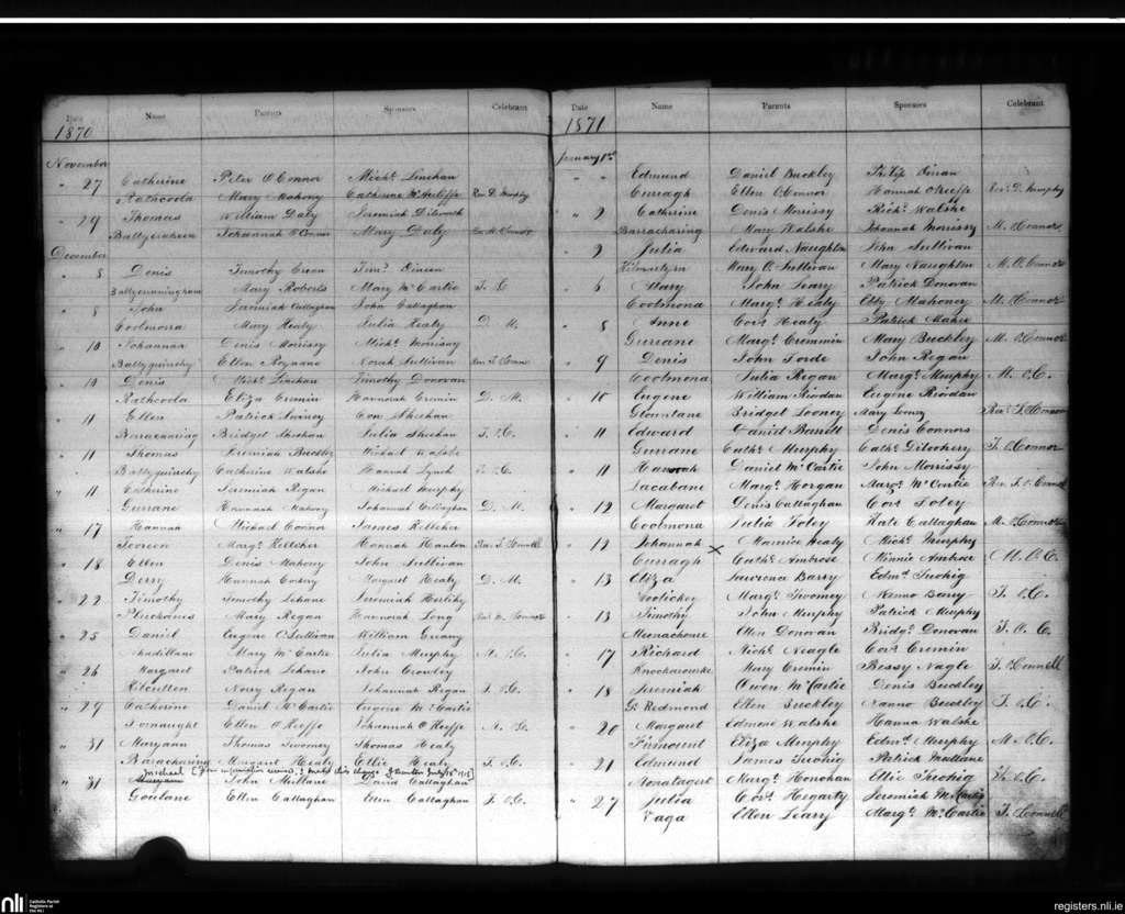 Donaghmore; County of Cork; Diocese of Cloyne. Baptisms, Nov. 1870 to Jan. 1871