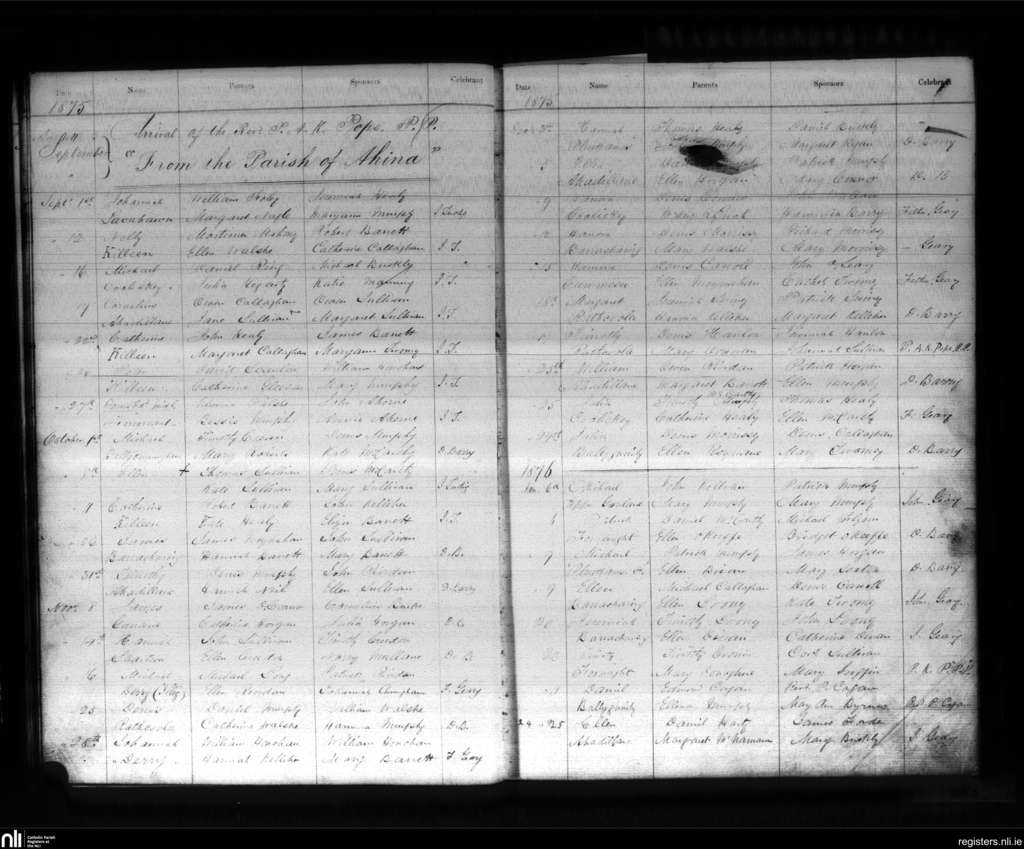 Donaghmore; County of Cork; Diocese of Cloyne. Baptisms, Sep. 1875 to Jan. 1876