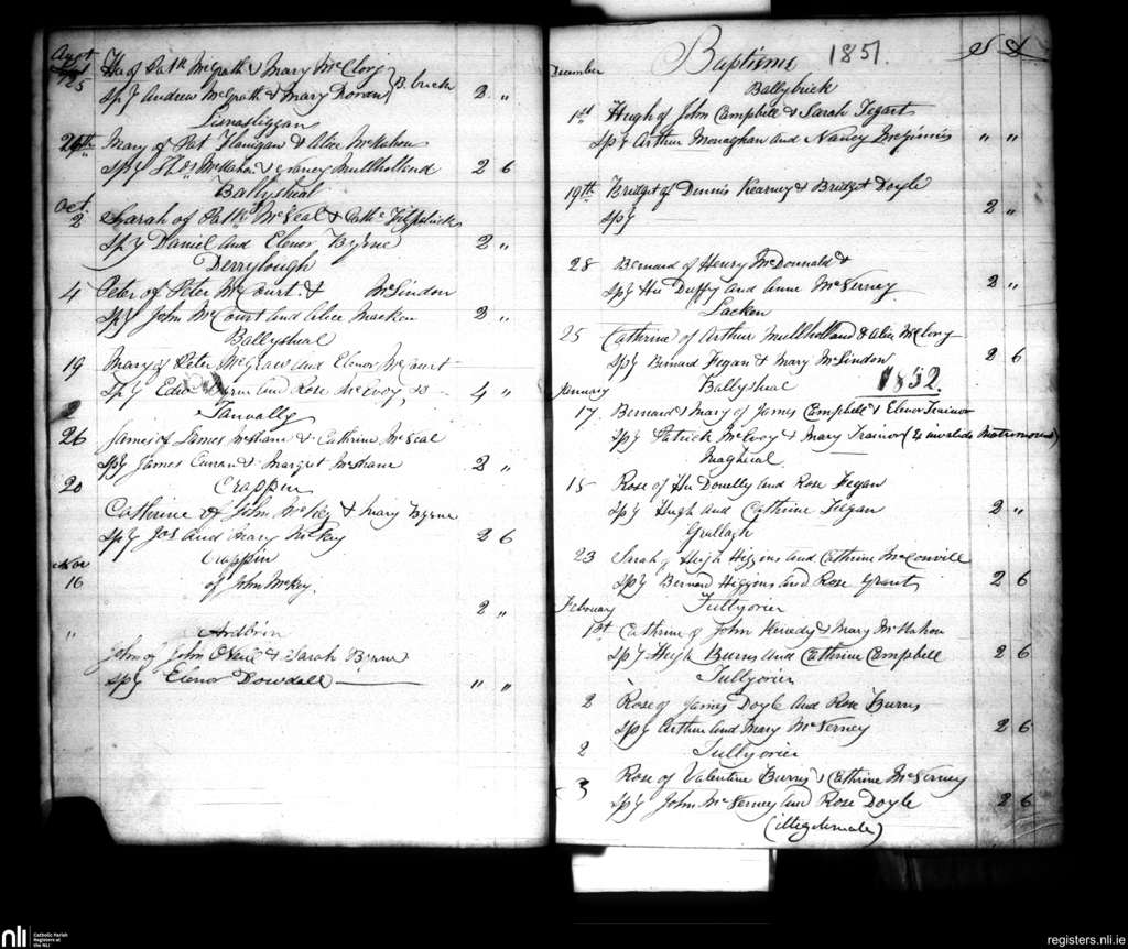 Annaghlone; County of Down; Diocese of Dromore. Baptisms, Aug. 1851 to Feb. 1852