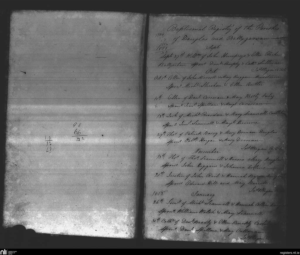 Douglas; County of Cork; Diocese of Cork and Ross. Baptisms, Sep. 1851 to Jan. 1852