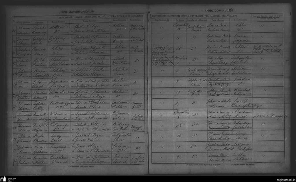 Arklow; County of Wexford, Wicklow; Archdiocese of Dublin. Marriages, Sep. 1863 to Nov. 1863
