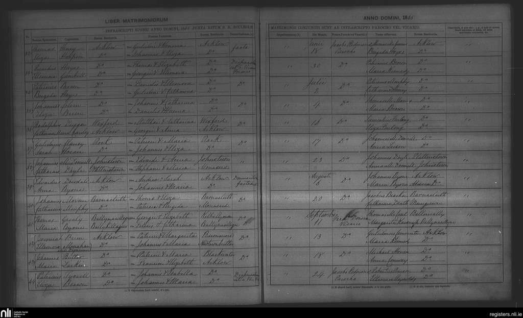 Arklow; County of Wexford, Wicklow; Archdiocese of Dublin. Marriages, June 1865 to Sep. 1865