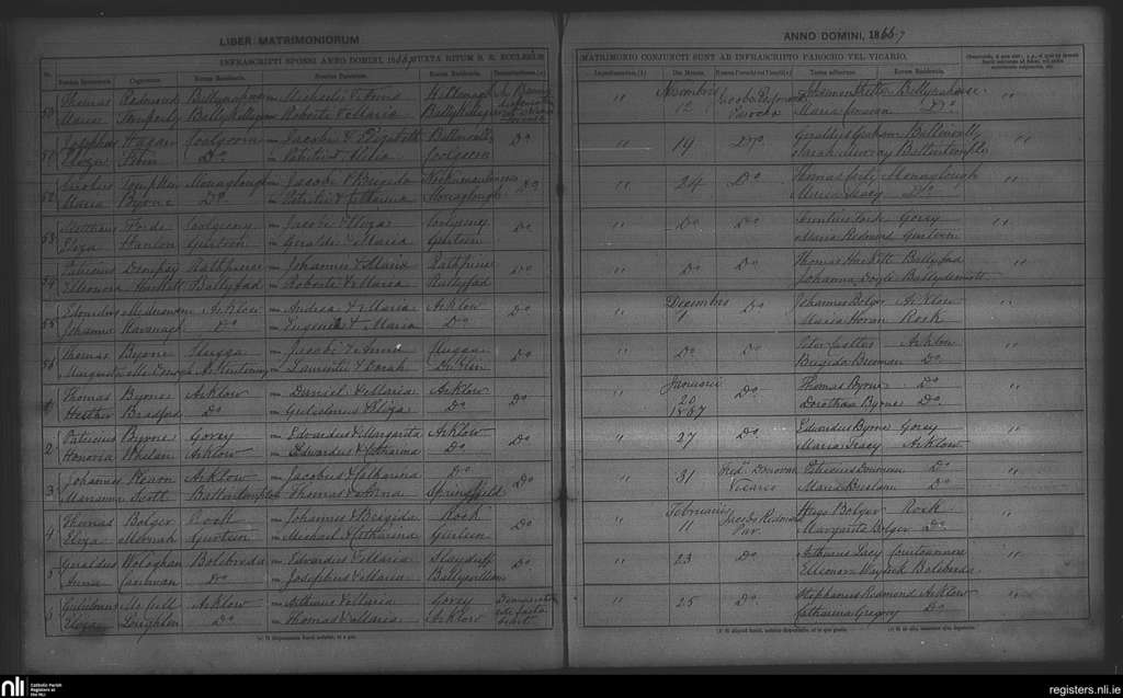 Arklow; County of Wexford, Wicklow; Archdiocese of Dublin. Marriages, Nov. 1866 to Feb. 1867