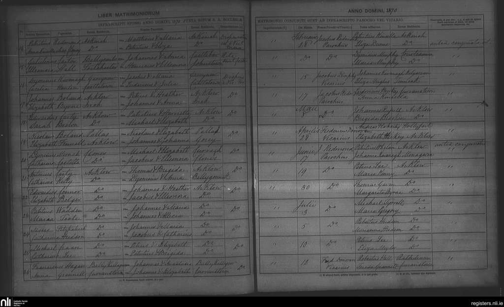 Arklow; County of Wexford, Wicklow; Archdiocese of Dublin. Marriages, Feb. 1870 to July 1870