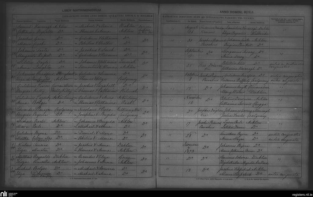Arklow; County of Wexford, Wicklow; Archdiocese of Dublin. Marriages, Aug. 1872 to Jan. 1873