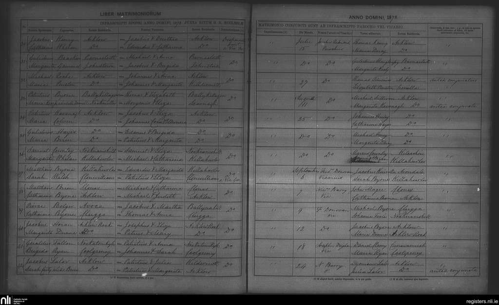 Arklow; County of Wexford, Wicklow; Archdiocese of Dublin. Marriages, July 1873 to Sep. 1873