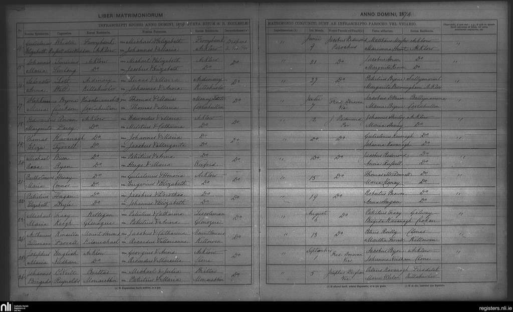 Arklow; County of Wexford, Wicklow; Archdiocese of Dublin. Marriages, June 1874 to Sep. 1874