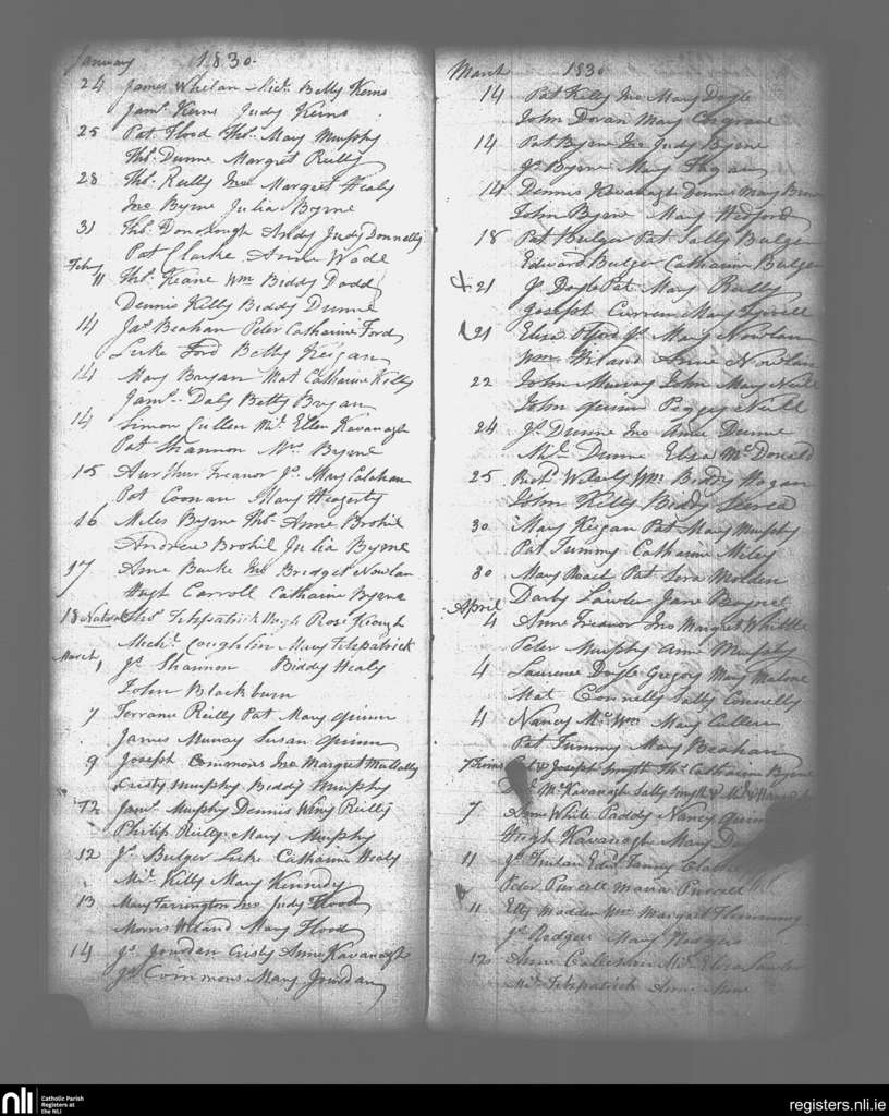 Ballymore Eustace; County of Wicklow, Kildare; Archdiocese of Dublin. Baptisms, Jan. 1830 to Apr. 1830