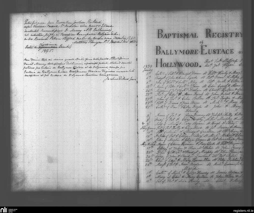Ballymore Eustace; County of Wicklow, Kildare; Archdiocese of Dublin. Baptisms, Jan. 1839 to Mar. 1839