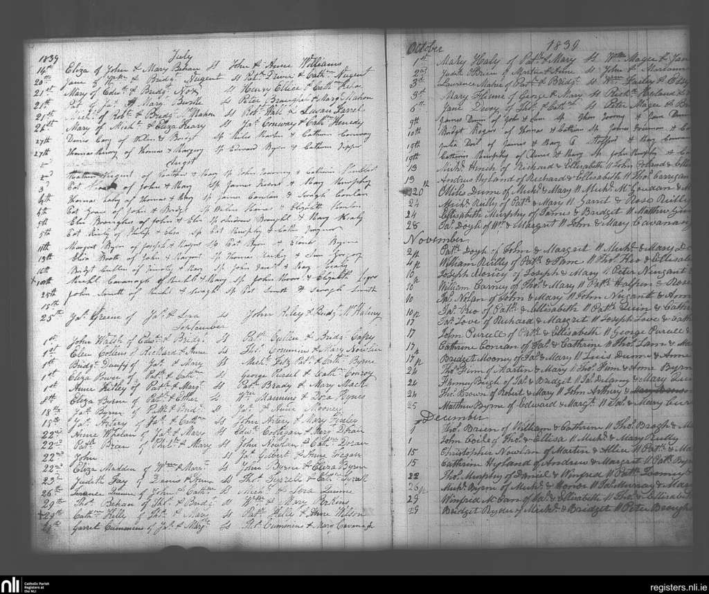 Ballymore Eustace; County of Wicklow, Kildare; Archdiocese of Dublin. Baptisms, July 1839 to Dec. 1839