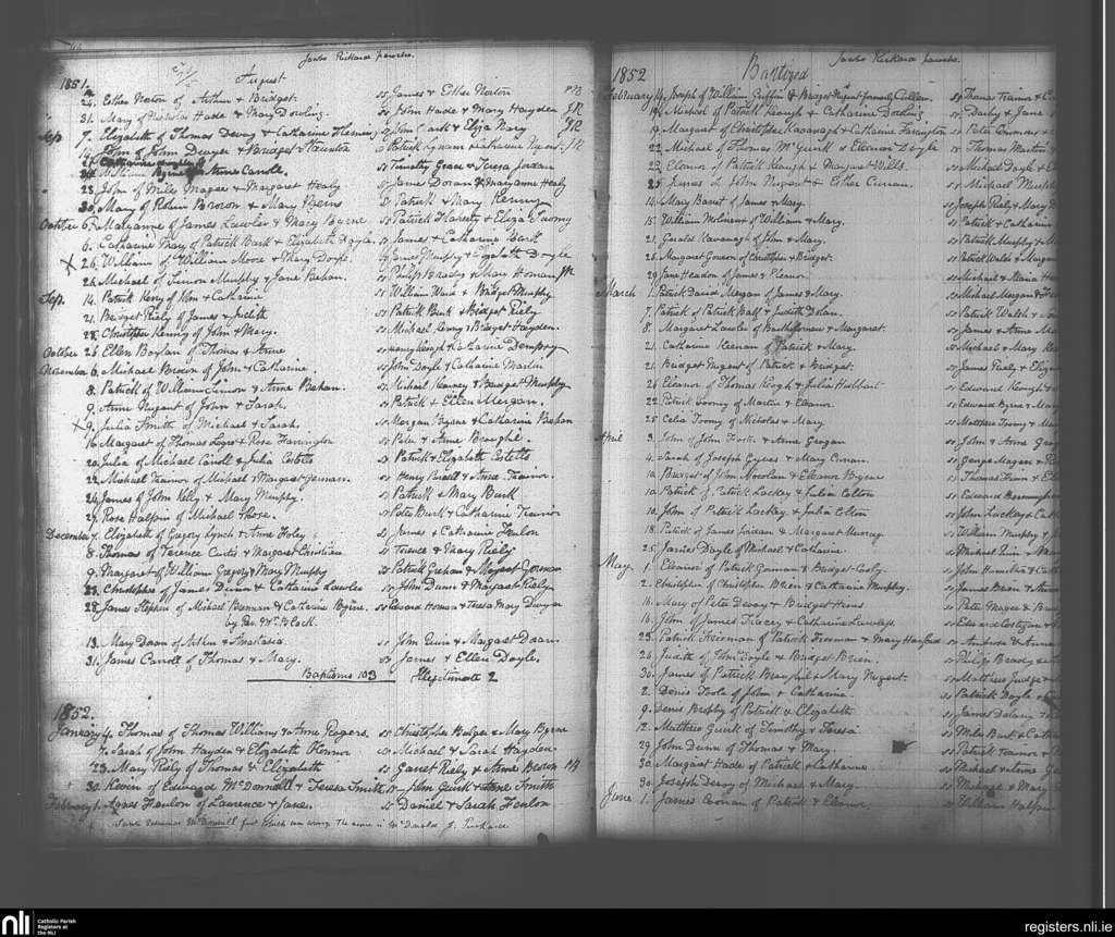 Ballymore Eustace; County of Wicklow, Kildare; Archdiocese of Dublin. Baptisms, Aug. 1851 to June 1852