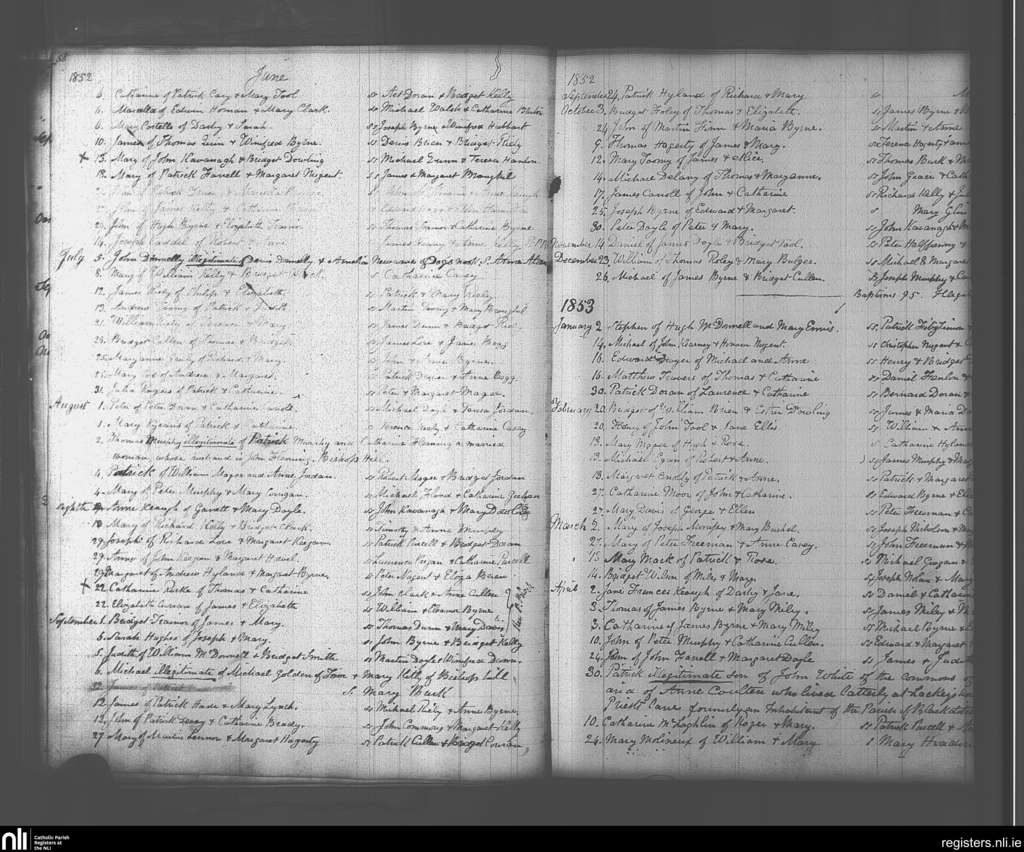 Ballymore Eustace; County of Wicklow, Kildare; Archdiocese of Dublin. Baptisms, June 1852 to Apr. 1853