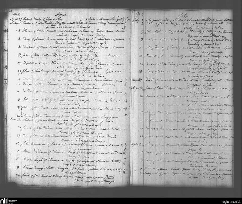 Ballymore Eustace; County of Wicklow, Kildare; Archdiocese of Dublin. Baptisms, Apr. 1853 to Sep. 1853