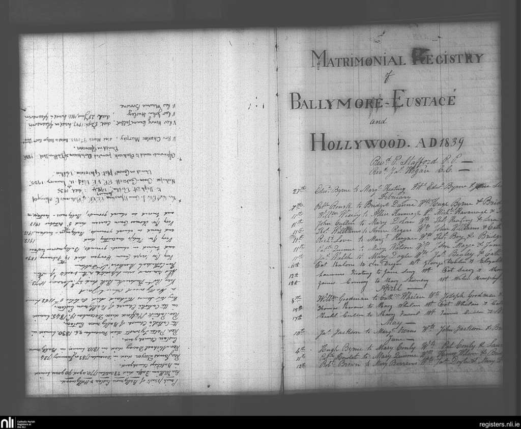 Ballymore Eustace; County of Wicklow, Kildare; Archdiocese of Dublin. Marriages, Jan. 1839 to June 1839