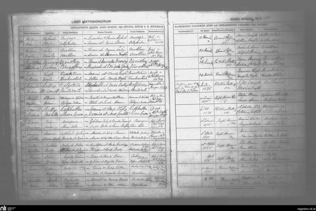 Ballymore Eustace; County of Kildare, Wicklow; Archdiocese of Dublin. Marriages, Nov. 1874 to May 1875