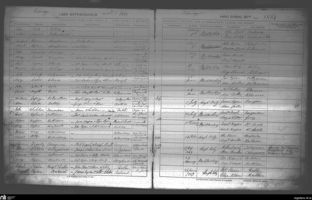 Kilbride; County of Wicklow; Archdiocese of Dublin. Marriages, Feb. 1858 to Jan. 1859