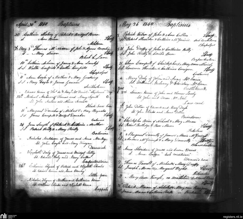 Blanchardstown; County of Dublin; Archdiocese of Dublin. Baptisms, Apr. 1840 to June 1840