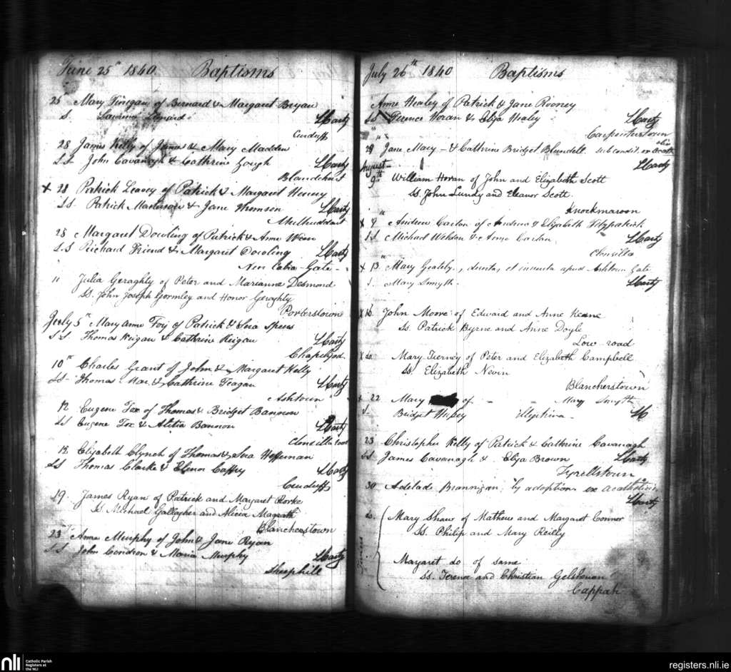 Blanchardstown; County of Dublin; Archdiocese of Dublin. Baptisms, June 1840 to Aug. 1840
