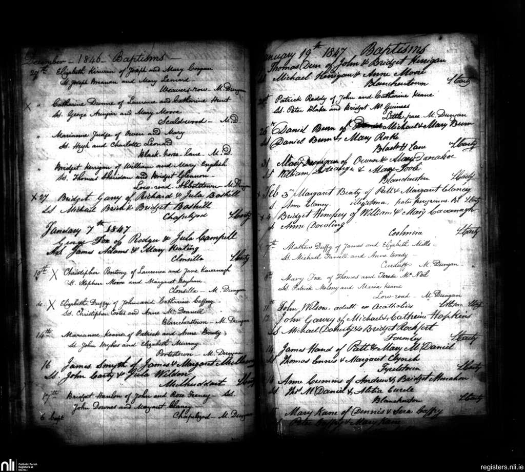 Blanchardstown; County of Dublin; Archdiocese of Dublin. Baptisms, Dec. 1846 to Feb. 1847
