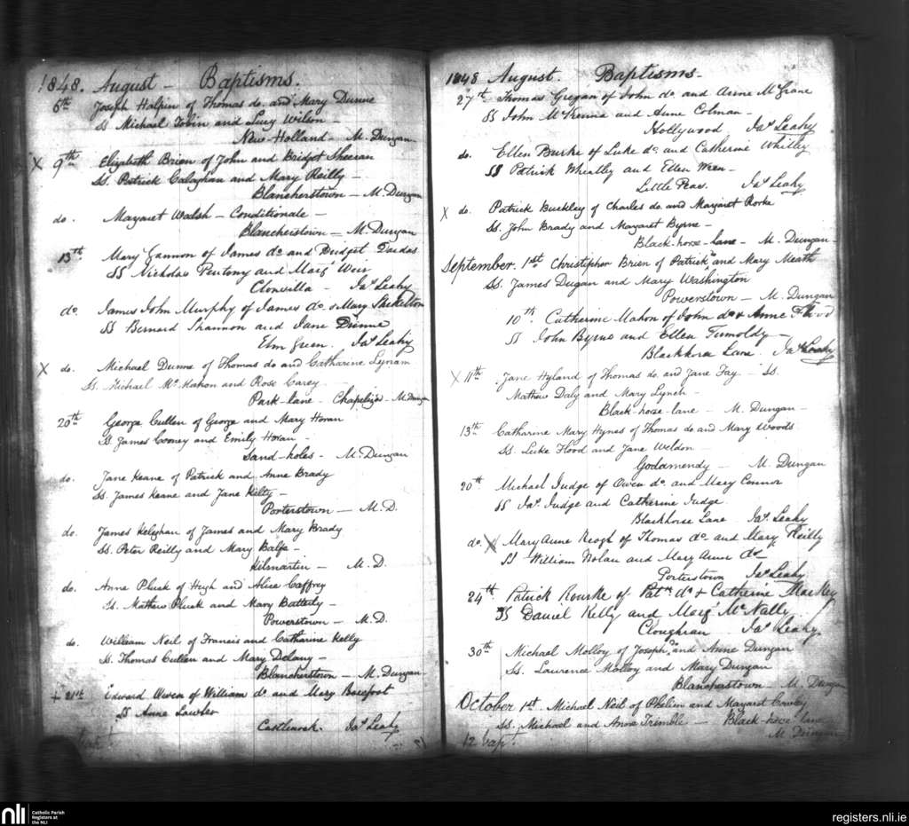 Blanchardstown; County of Dublin; Archdiocese of Dublin. Baptisms, Aug. 1848 to Oct. 1848