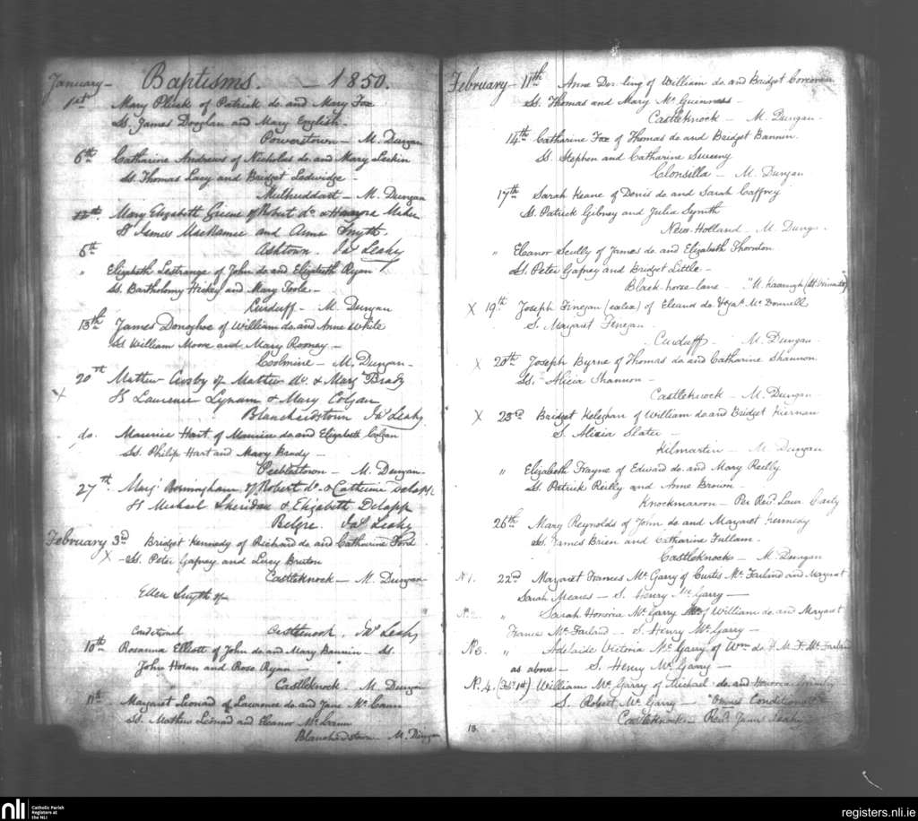 Blanchardstown; County of Dublin; Archdiocese of Dublin. Baptisms, Jan. 1850 to Feb. 1850