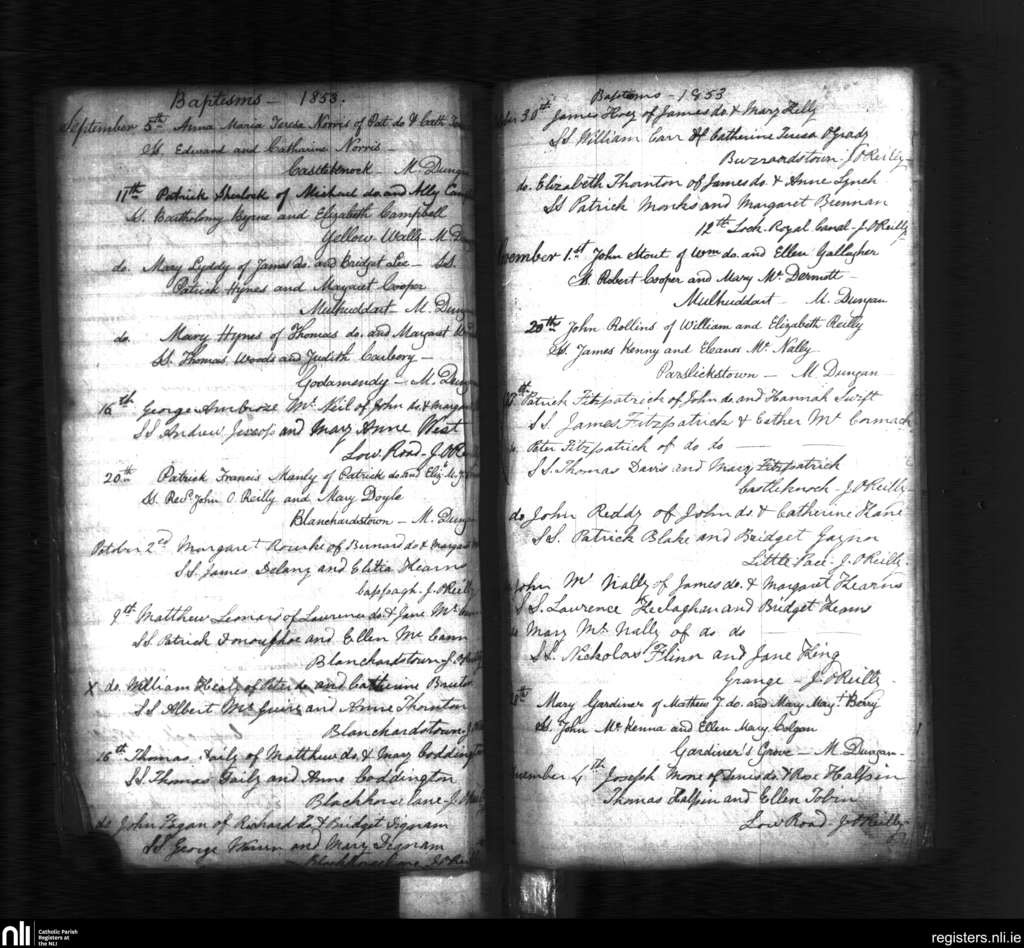 Blanchardstown; County of Dublin; Archdiocese of Dublin. Baptisms, Sep. 1853 to Dec. 1853