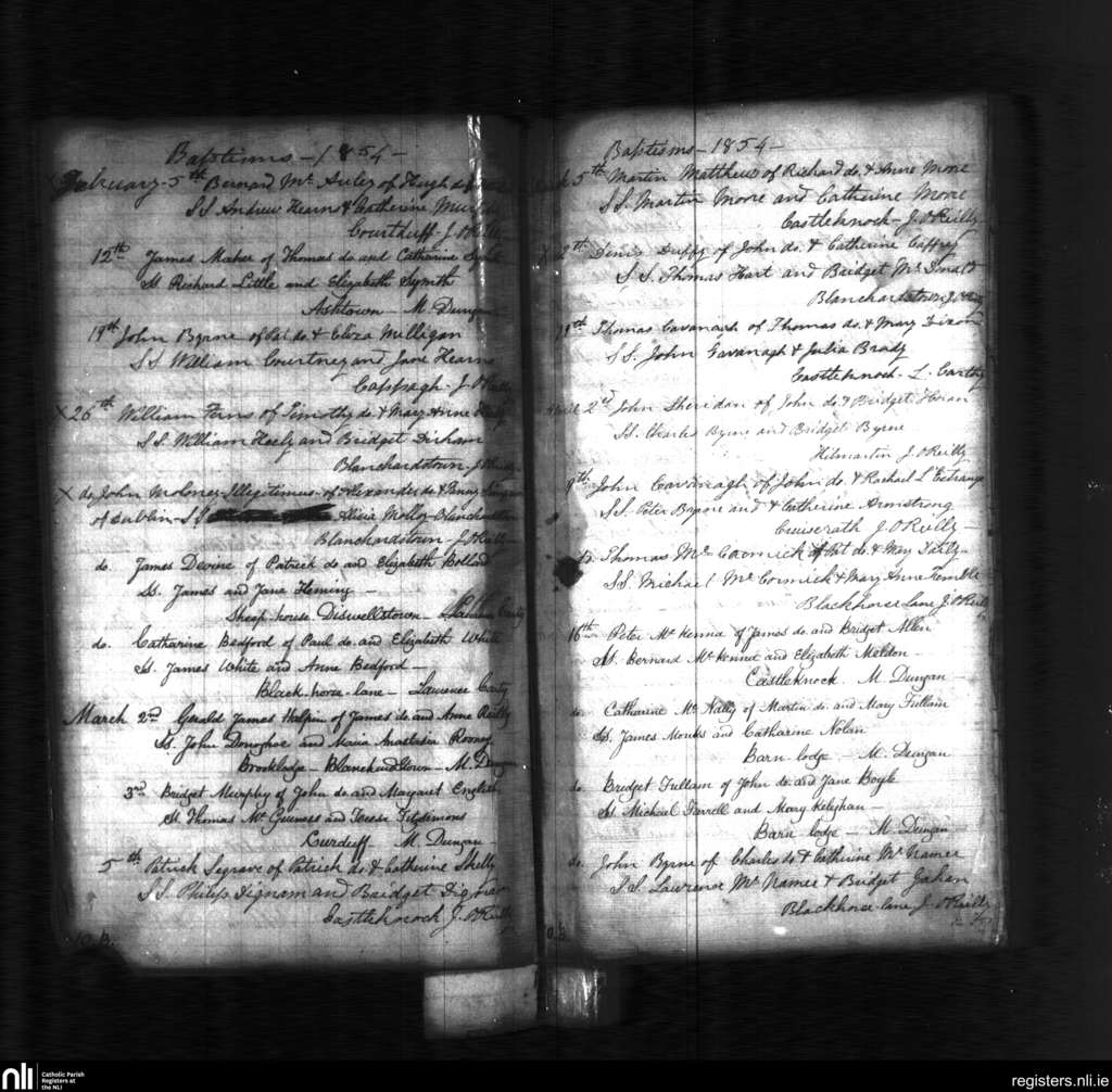 Blanchardstown; County of Dublin; Archdiocese of Dublin. Baptisms, Feb. 1854 to Apr. 1854