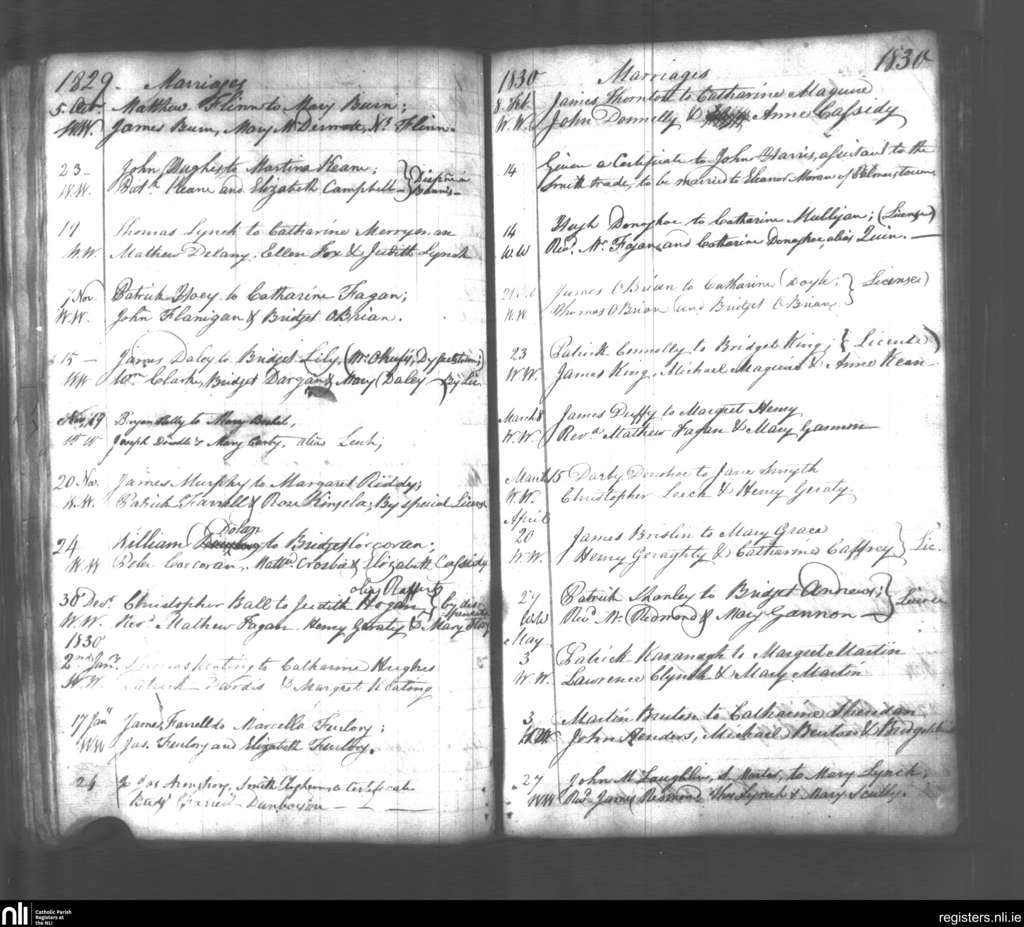 Blanchardstown; County of Dublin; Archdiocese of Dublin. Marriages, Oct. 1829 to May 1830