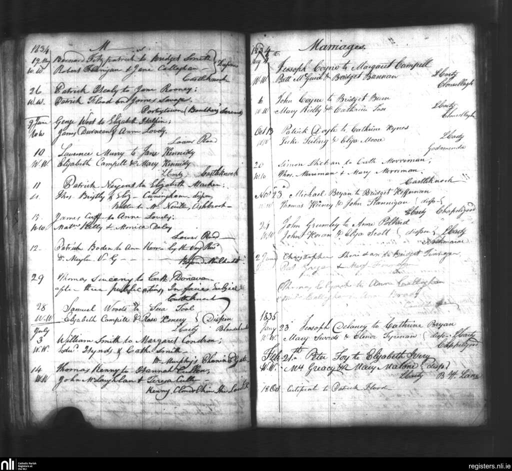 Blanchardstown; County of Dublin; Archdiocese of Dublin. Marriages, May 1834 to Feb. 1835