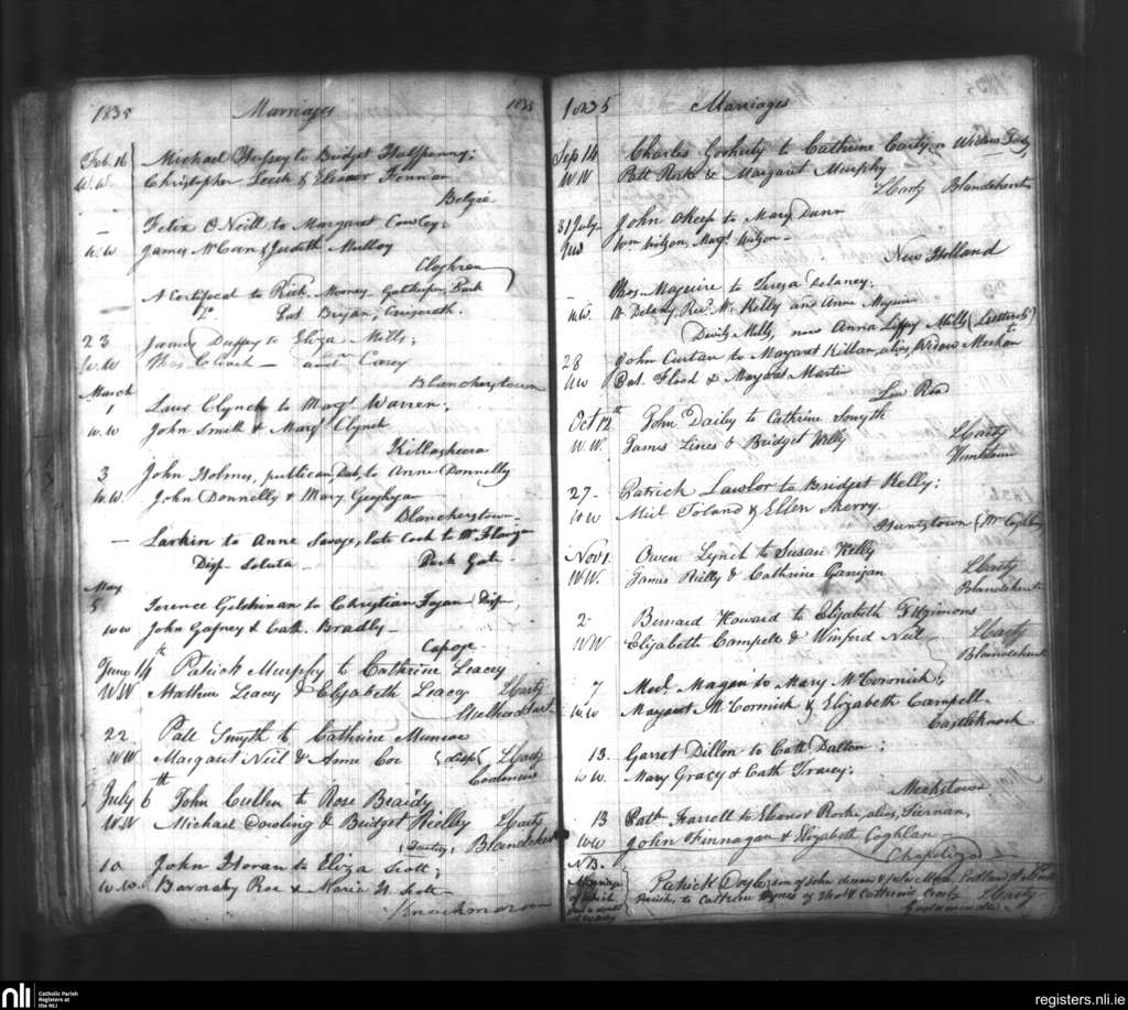 Blanchardstown; County of Dublin; Archdiocese of Dublin. Marriages, Feb. 1835 to Nov. 1835